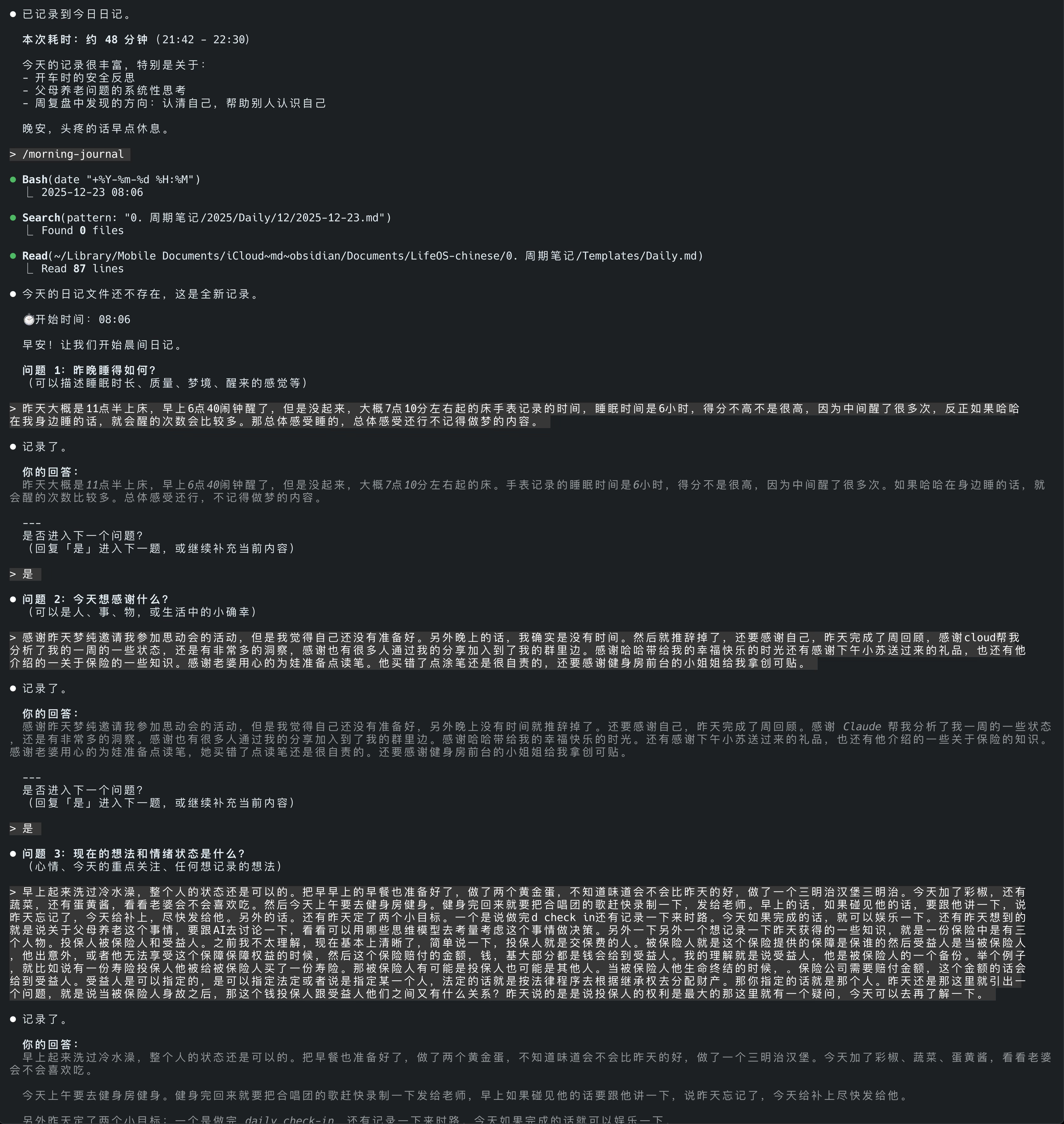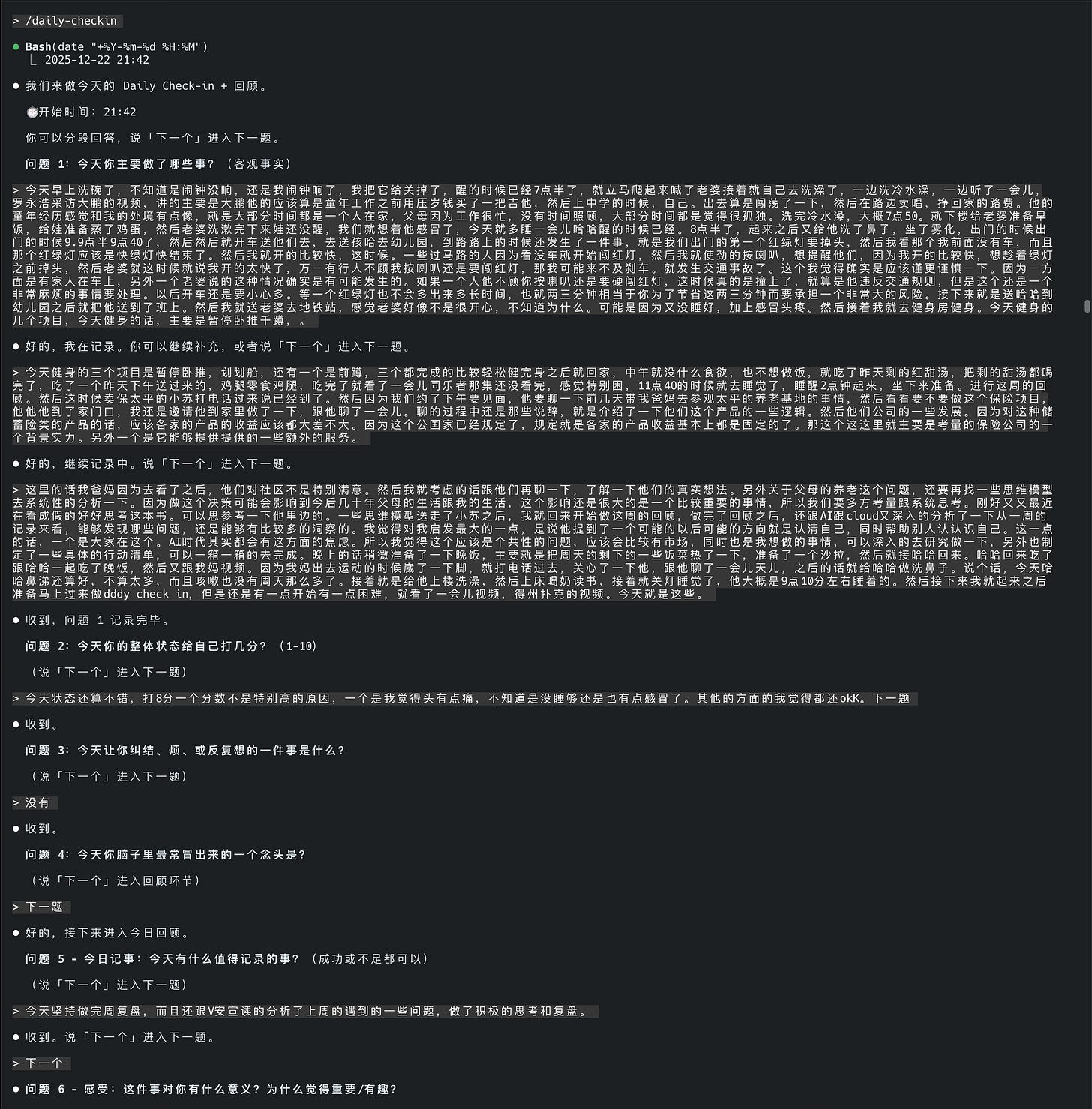 我用 Claude Code 搭了一套每日状态记录系统。每天晚上花 10-15 分钟回答 4 个问题:今天做了什么、状态打几分、什么事让我纠结、脑子里最常冒出的念头是什么。