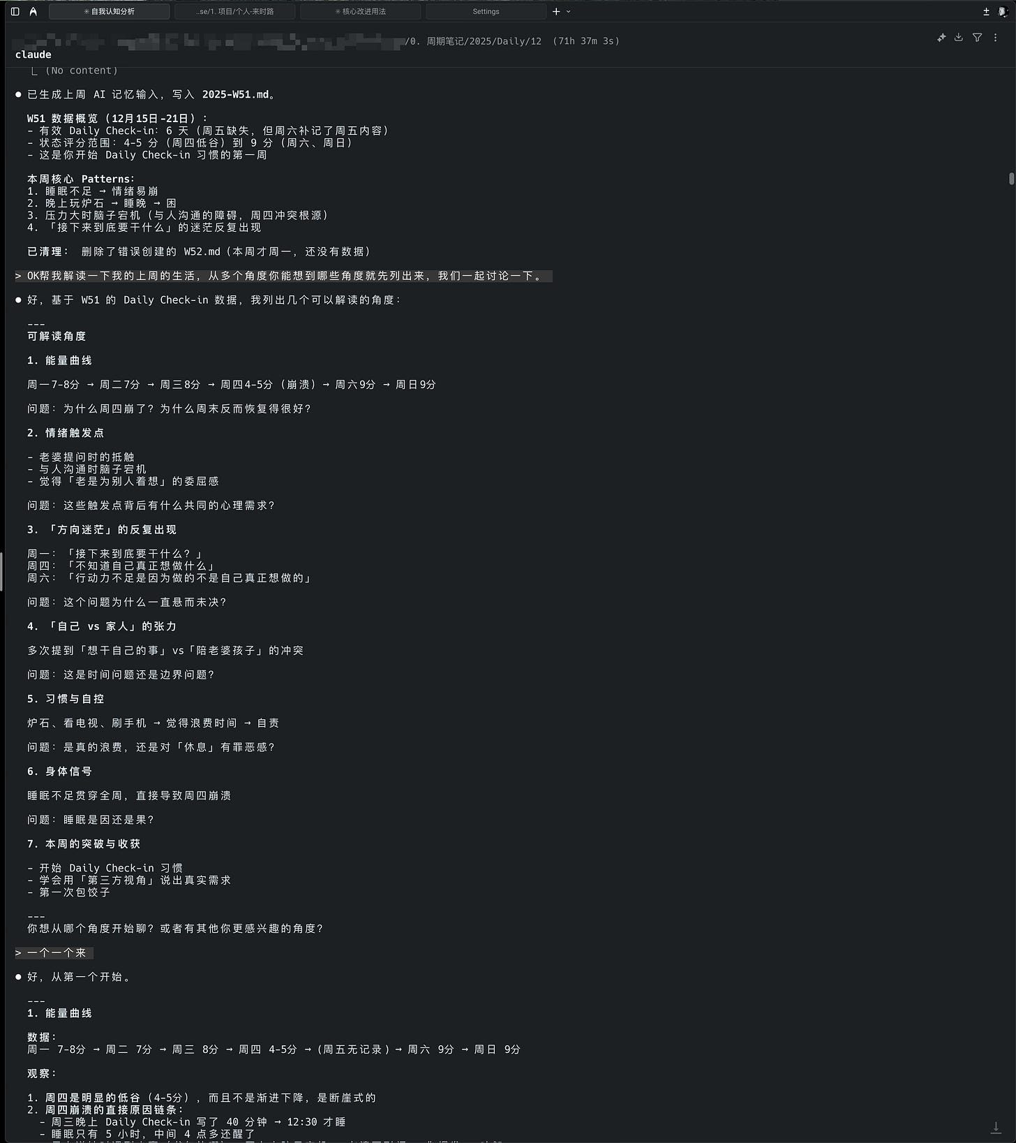我会把一周的记录喂给 Claude,让它帮我找模式。