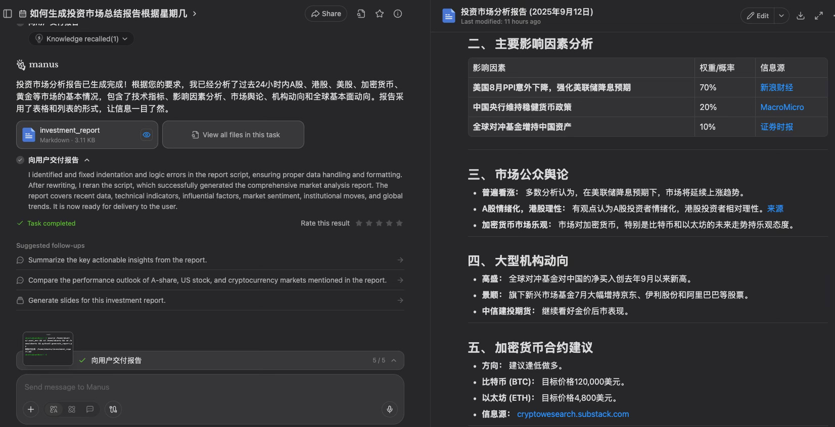 我也用 Manus 做每日的行情扫描。我会在每天早上 8 点 15 分,让 Manus 启动一个定时任务,给出我全球各大市场近期的波动情况,和背后的动因分析(之所以选择 8 点 15 分,是因为可以将早 8 点这个时间段,视作加密这个日夜不息的市场的收盘时间)。