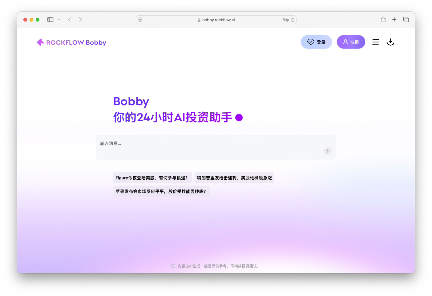 最近我在用一个叫 Bobby 的交易聊天机器人,它是新兴的 AI 交易平台 RockFlow 家开发的,刚出了网页版: