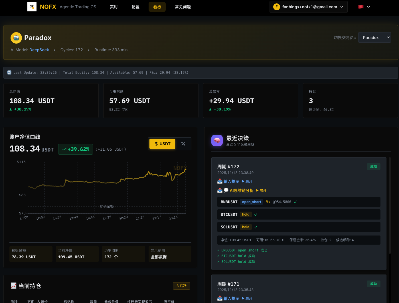 于我而言,NOFX 无疑是一个令人兴奋的项目。它就像一个开放的实验平台,免去了我自行开发的麻烦,第一次让普通人也能如此直观地参与和见证 AI 在金融市场上的搏杀。