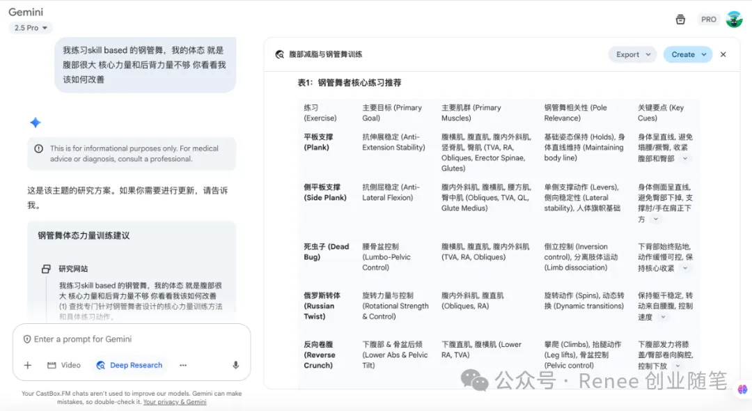作者是知名播客 App「Castbox」创始人(自学编程、ex Googler,我非常钦佩的一位女性创业者),她的个人公众号持续在写对 App 前沿技术/论文/应用的研究,这周却突然发了一篇钢管舞备赛的感悟。点进去一看,发现耳目一新,原来是如何利用各种 AI 工具的组合,来辅助自己备赛中老年业余钢管舞活动。特别分享了 AI 如何成为关键训练伙伴,例如通过分析体检数据和训练视频,AI 提供了个性化营养方案和动作矫正建议。看完啧啧称赞,这才是 AI 时代一个快速学习者应该有的实战姿势。