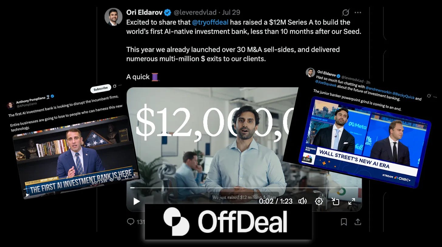 一篇英文深度好文。OffDeal 作为首家 AI 原生投资银行,通过 12M 美元 A 轮融资估值达 100M 美元,其 AI 技术自动化了传统投行中 80% 的重复性工作,使小型交易(10M-100M 美元)变得经济可行。公司采用独特的两人工位交易舱模式,结合 AI 工具如买家匹配引擎、自动生成 30 页推介书,已促成 30 笔交易,目标 2027 年实现 100M 美元收入。其病毒式传播策略避开传统 PR 机构,直接接触媒体和影响者,成功吸引华尔街精英加入。这个模式颠覆了传统投行对小型交易的忽视,解决了中小企业主长期面临的交易服务缺口。一些数据/策略摘要: