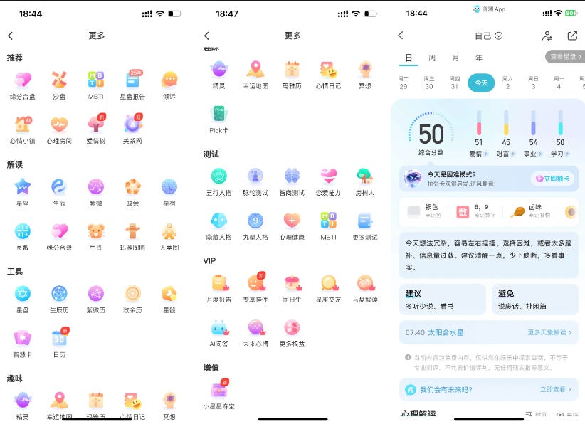 测测创始人任永亮将星座、MBTI 等泛心理工具产品化,打造出持续盈利、数亿营收的测测 App。这款产品通过算法分析用户情绪和行为,吸引了 5000 万注册用户,其中 80% 为一线城市女性。而达成这样的成果时,团队不过 200 人(以上都是他们在访谈中自行披露的数据)。任永亮从北大医学部背景转向 AI 机器学习,他认为未来产品应打破抖音式多巴胺循环,转向具身智能的陪伴机器人。他也提到了玄学与科技结合从而创造商业价值的观点。