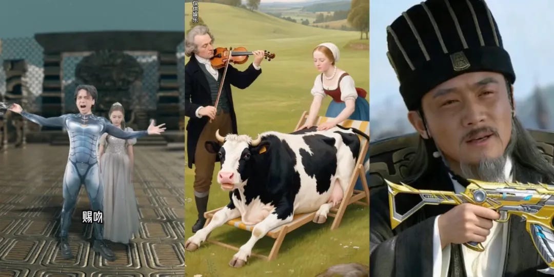 经典影视重构:博主「安提米苏」让《三国演义》的蜀军全员手持现代枪支,为 CF 手游打广告,获赞超 20 万。AI 打破了时空和成本限制,让高铁穿行古城、诸葛亮开拖拉机送货的脑洞毫无违和感,实现了 IP 流量与游戏玩家的双向转化。