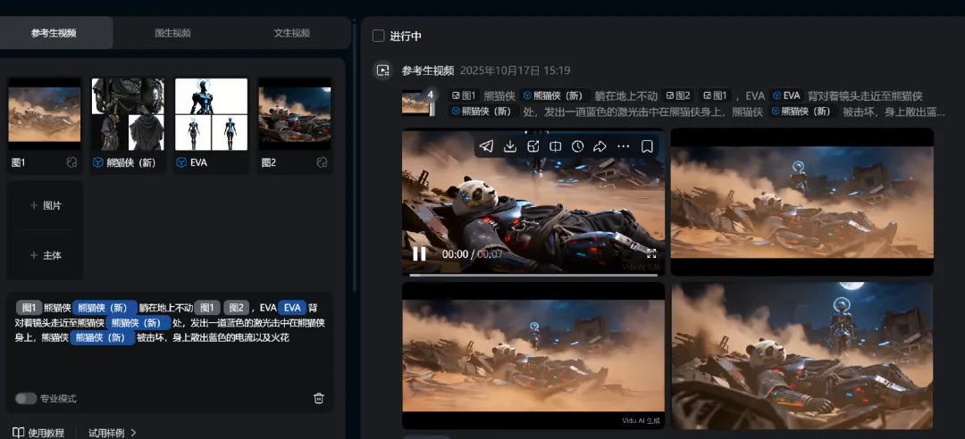 具体来说,他们做了三件事:第一,设计专属「脚本 Bot」和「Q2 多参 Bot」,把剧本自动拆解成 AI 能理解的结构化指令,解决了角色前后不一致的行业痛点;第二,搭建类似演员库的「主体库」,把角色、场景、道具提前定型,再利用 Vidu Q2 的参考生视频功能批量生成,让分镜制作效率提升 50% 以上;第三,面对 AI 不擅长的细腻表情和复杂打斗,他们用「技术妥协」策略——比如增加对白密度来弥补表演不足,用 3 天死磕 6 分钟打斗戏的细节调整。