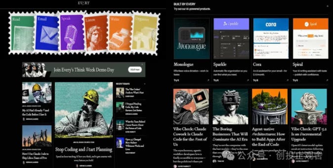 Every 的两位创始人 Dan 和 Nathan 最初都是经营付费 newsletter 的作家,这让他们积累了一批精准、高客单且粘性强的创作者用户。这批用户不仅提供了初始收入,更成了后来 AI 工具产品的「种子测试员」,让产品开发从一开始就瞄准了真实、高频的痛点。