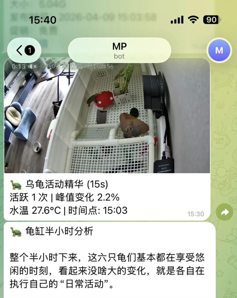 养龟这件事,被一个程序员玩出了花——水温监控、行为分析、录像推送,全是 AI 在跑。很喜欢这类极客实操的复盘内容。