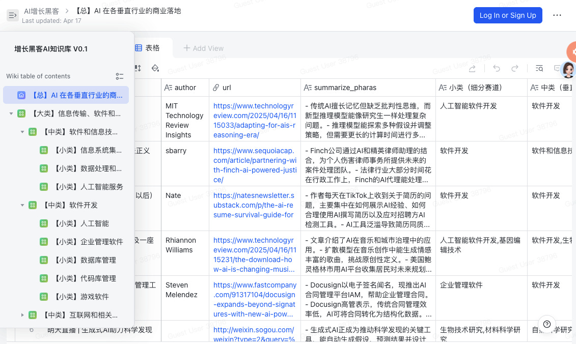 会根据内容中所提及的 AI 项目,自动打标「所属领域(大类)、垂直行业(中类)、细分赛道(小类)」。也会展示当前追踪中的详细信源列表。